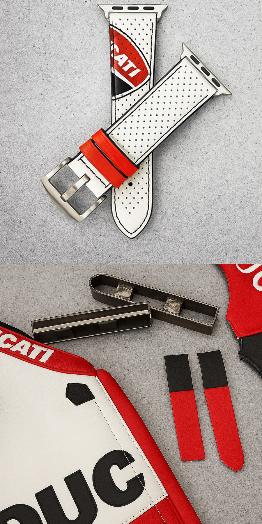 Rennanzug-Edition. Limitierte Stückzahl. Aus Teilen eines originalen Ducati-Corse Rennanzugs. Jedes Band ein Unikat Exclusiv für alle Apple Watch UltraModelle.